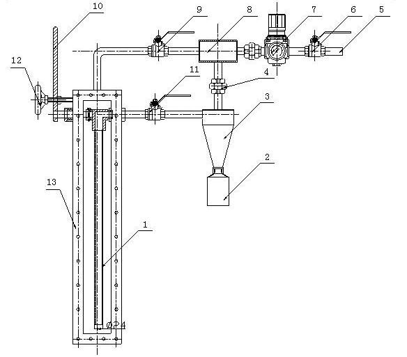 如上圖所示,該產(chǎn)品主要由1.取樣管、2.取樣瓶、3旋風(fēng)分離器、4.連接活接頭、5.進(jìn)氣管道、6.壓縮空氣控制閥、7.壓縮空氣調(diào)壓閥、8.射器抽氣器、9.吹掃閥、10.取樣操作桿、11.取樣閥、12.定位手輪、13.外殼體等部分組成。各部分功能如下: