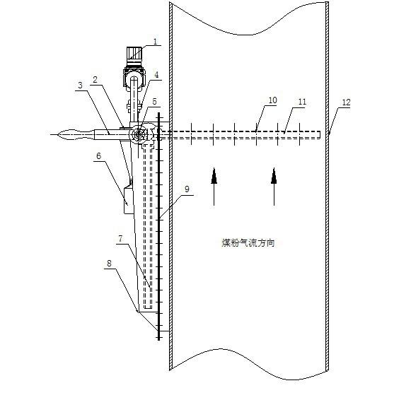 7、隱藏時(shí)的取樣管 8、外殼體 9、安裝法蘭 10、多個(gè)取樣點(diǎn) 11、取樣時(shí)的取樣管 12、煤粉管道